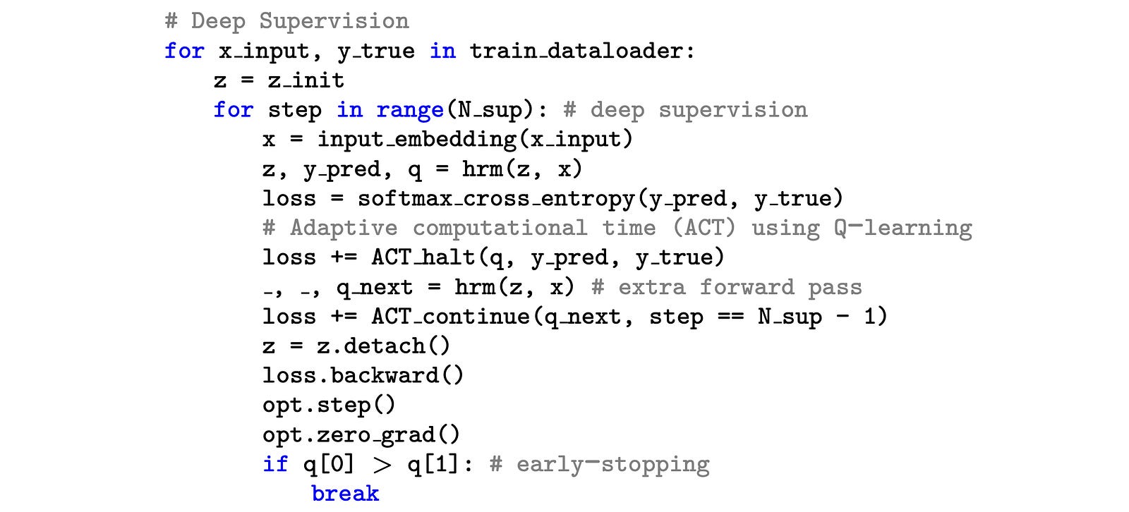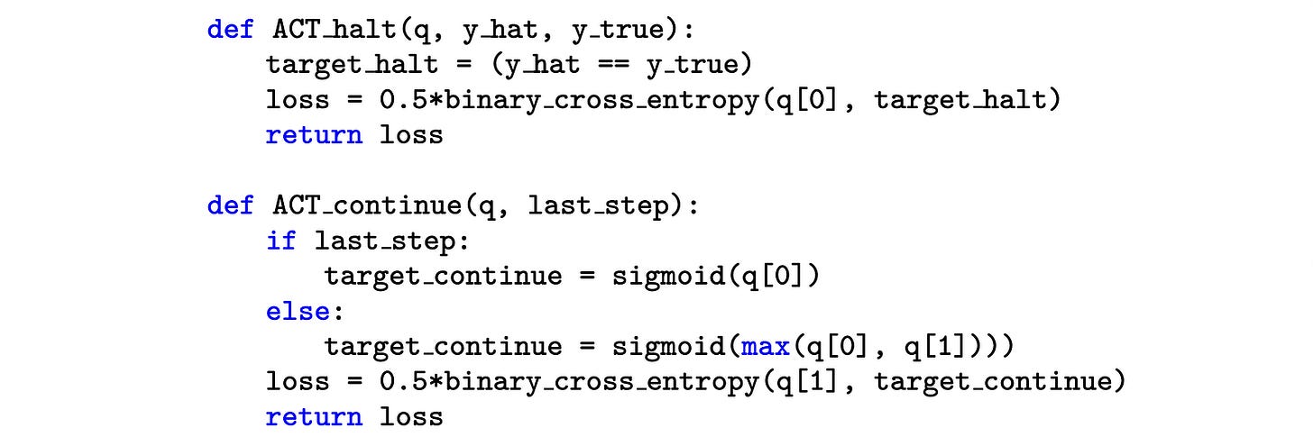 For this, ACT uses a Q-learning objective with a halting loss and a ‘continue’ loss. The ‘continue’ loss requires an extra forward pass through the HRM. This means that while ACT makes training per sample more efficient, it requires two forward passes per optimization step, which makes its overall use inefficient.