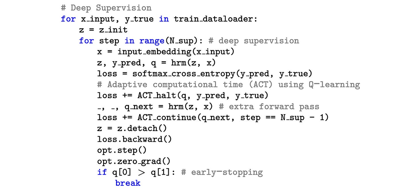 Alongside this, a halting mechanism (q_hat) predicts whether the current answer is correct. If so, the model stops recursion early (before completing all N_supervision cycles) during training to save on compute.